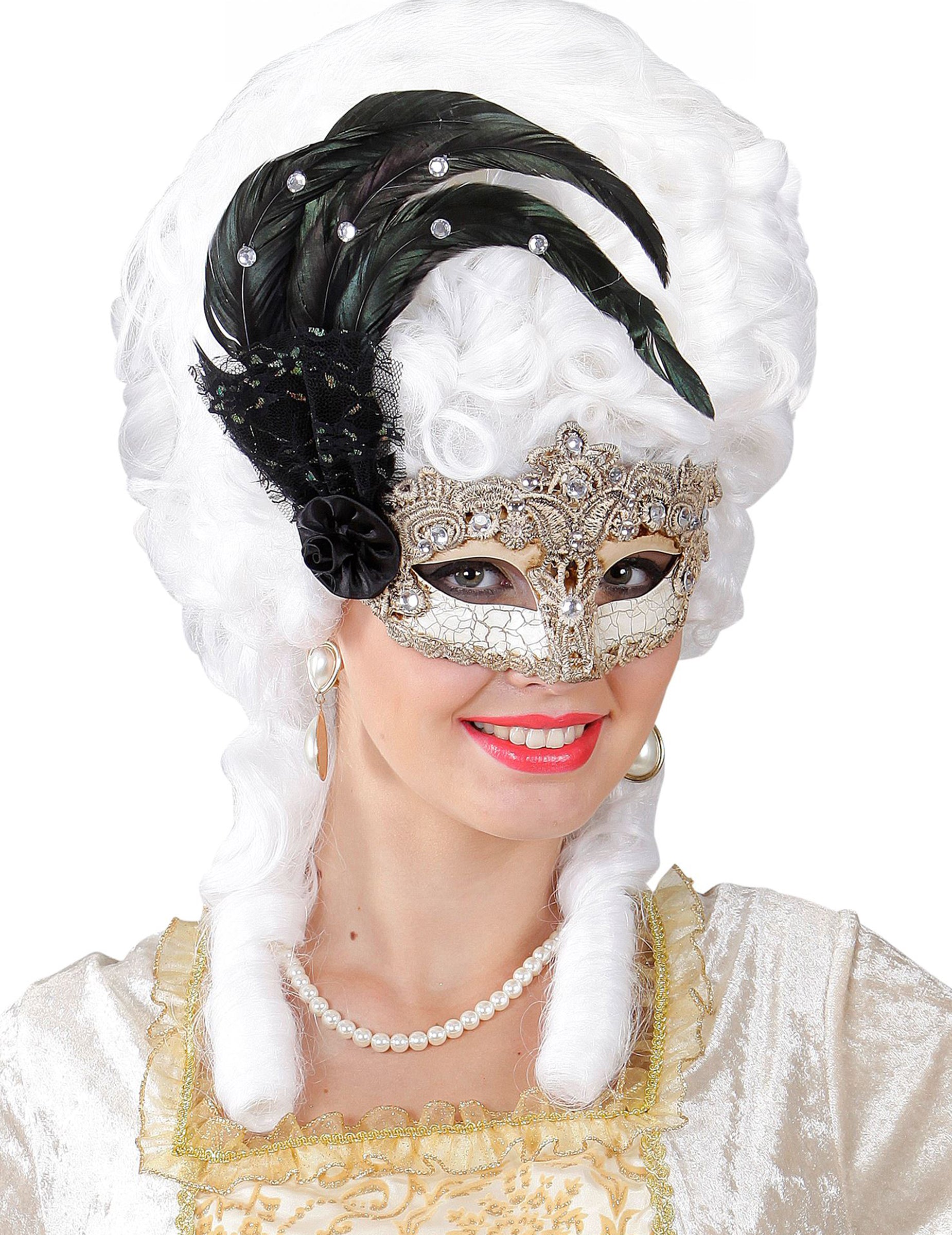 Sur le côté, un ensemble de plumes noires ornées de petites perles apporte du volume et crée un contraste marqué avec la partie claire du masque. Une petite fleur noire complète la décoration.