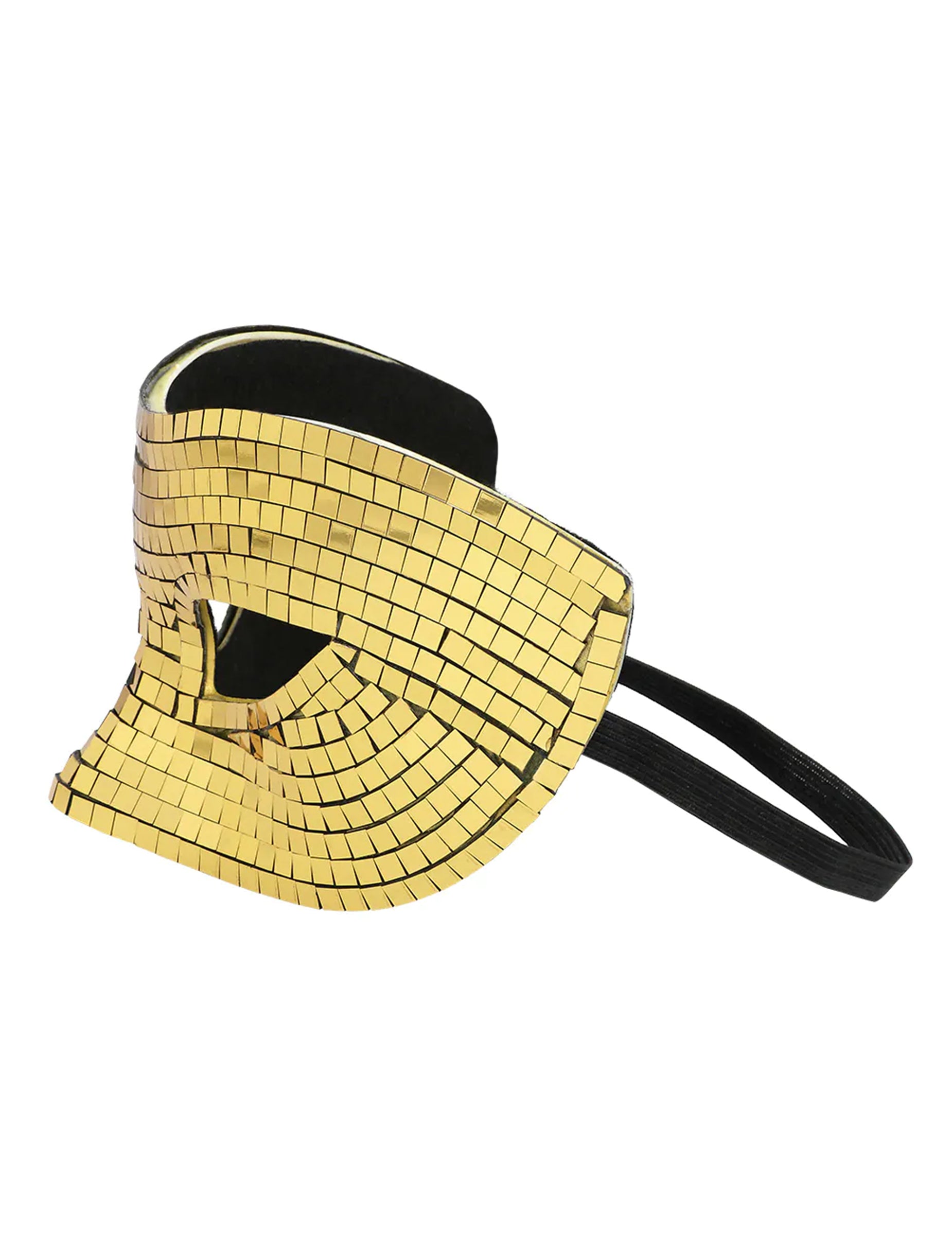 Această mască disco cu fațete aurii pentru adulți evidențiază un strat compus din mici fațete pătrate ce creează un efect luminos de oglindă.