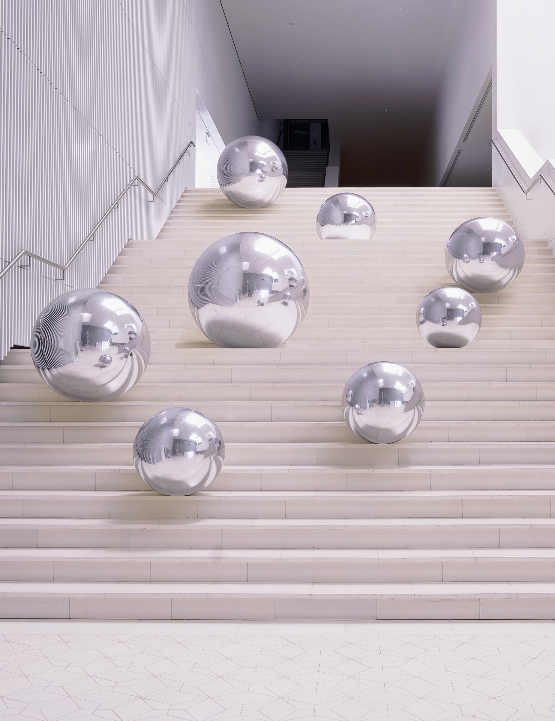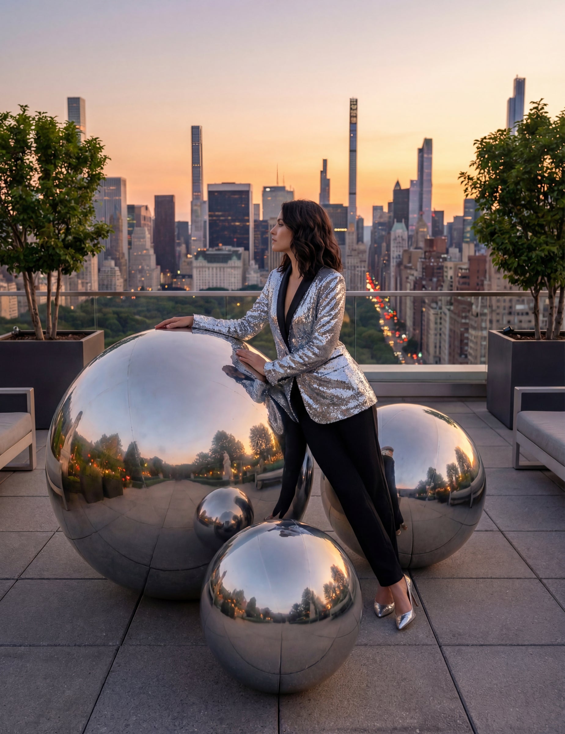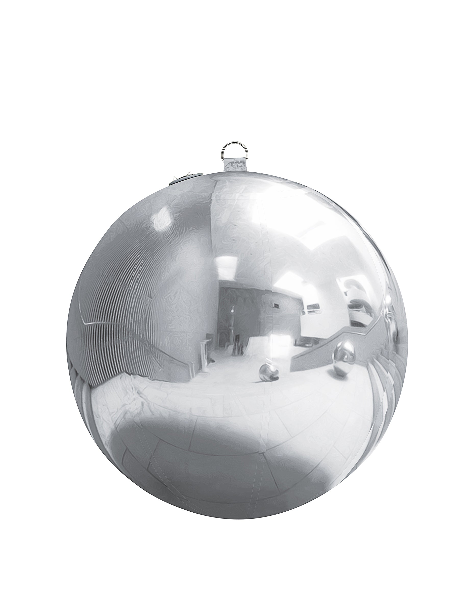 Are o suprafață argintie cu efect de oglindă care reflectă lumina și elementele din jur. Forma sa sferică și diametrul de aproximativ 60 cm facilitează integrarea ei într-o sală, un spațiu de recepție sau un decor foto.