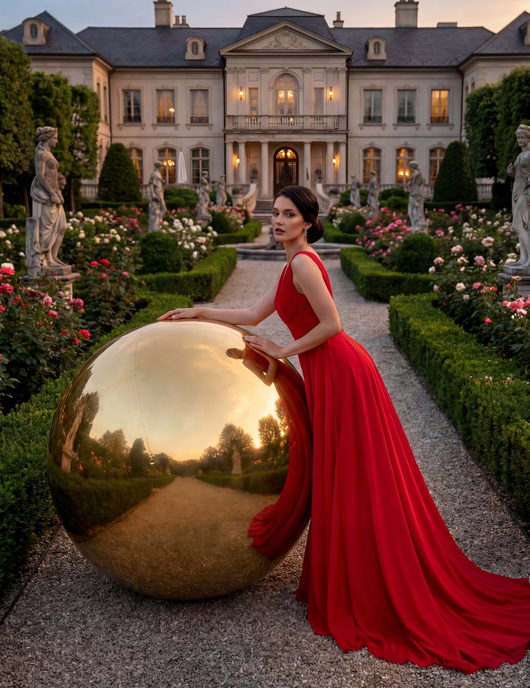 Are o suprafață aurie cu efect de oglindă, care reflectă lumina și mediul înconjurător. Forma sa sferică și dimensiunea mare de aproximativ 120 cm o fac un element decorativ vizibil, potrivit pentru săli, grădini sau zone foto la o petrecere.