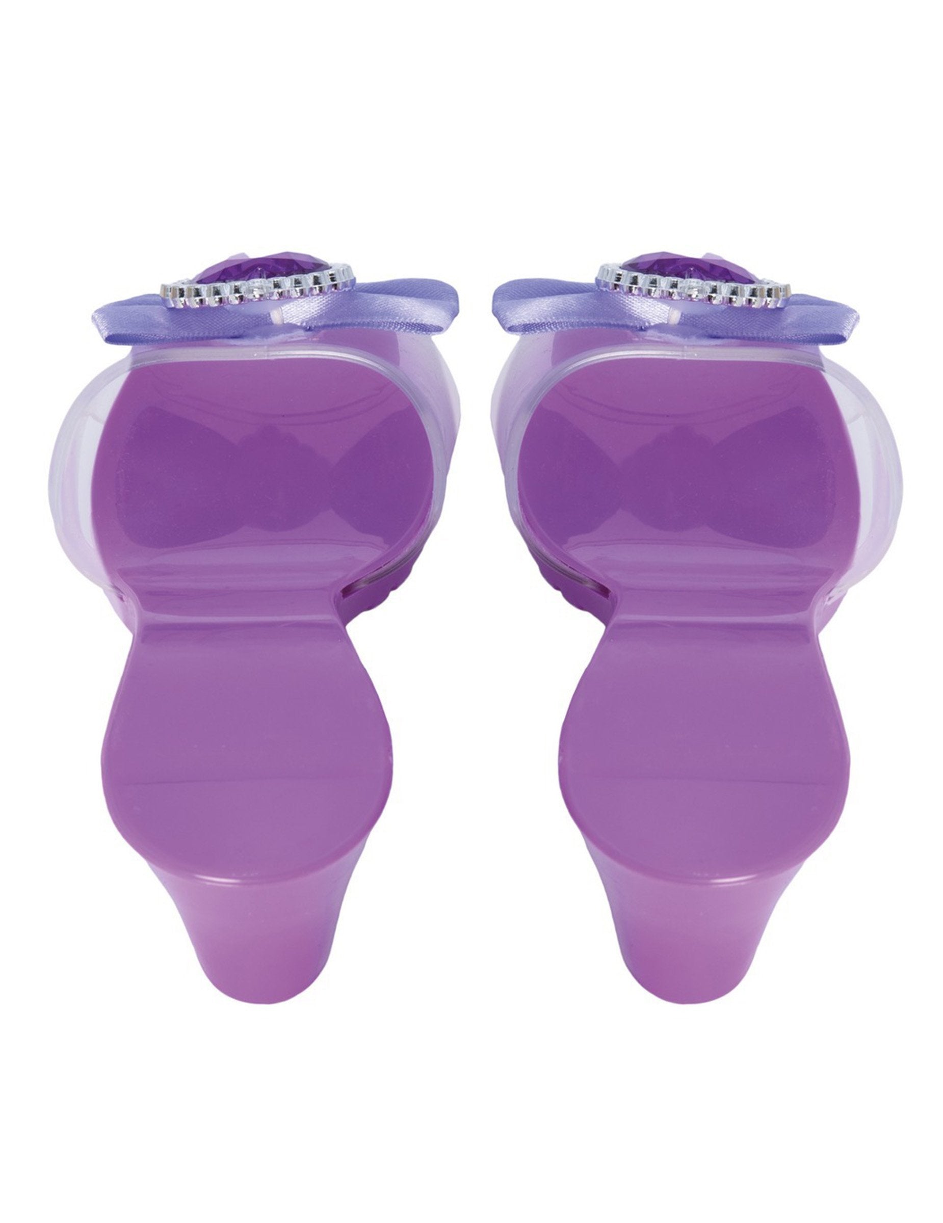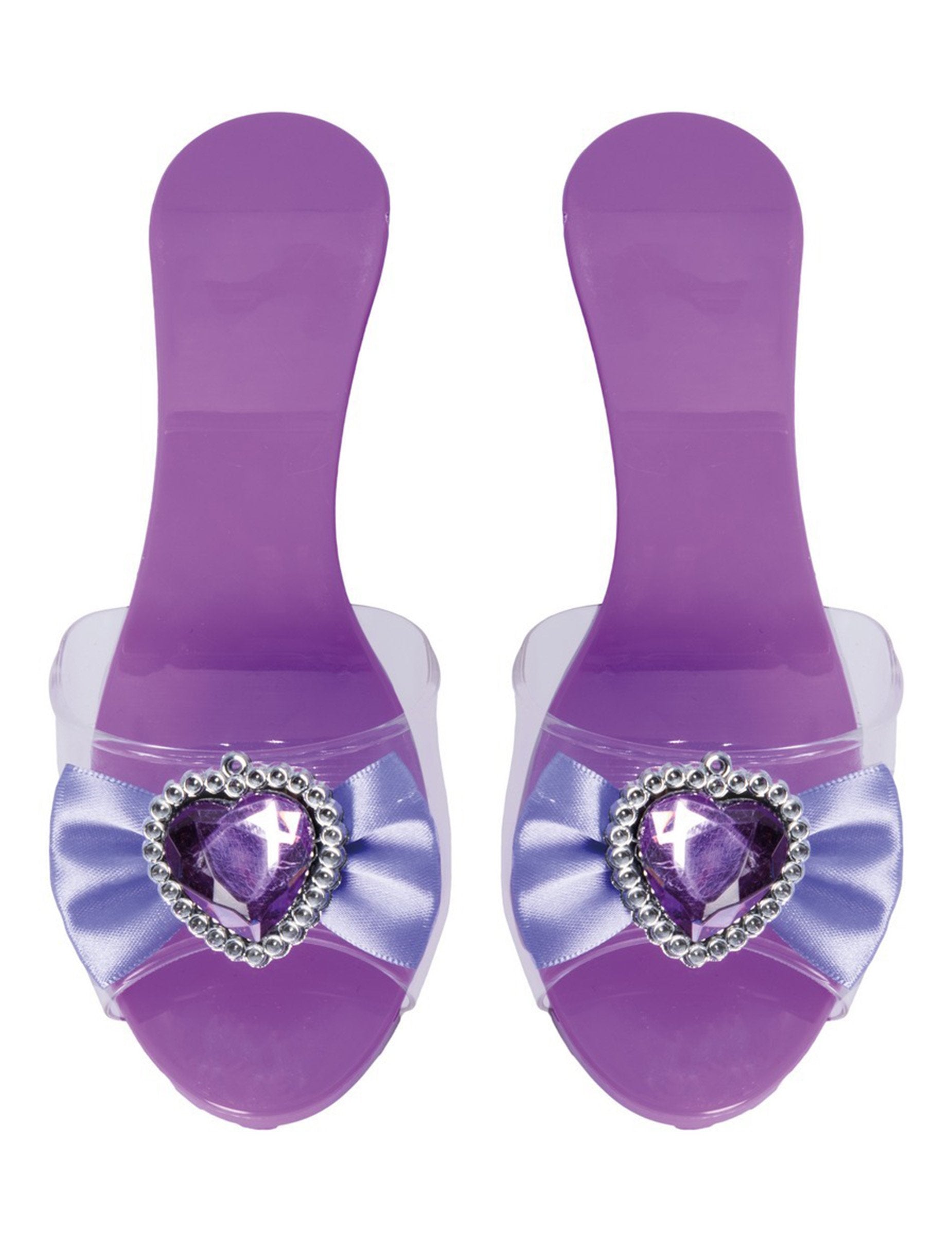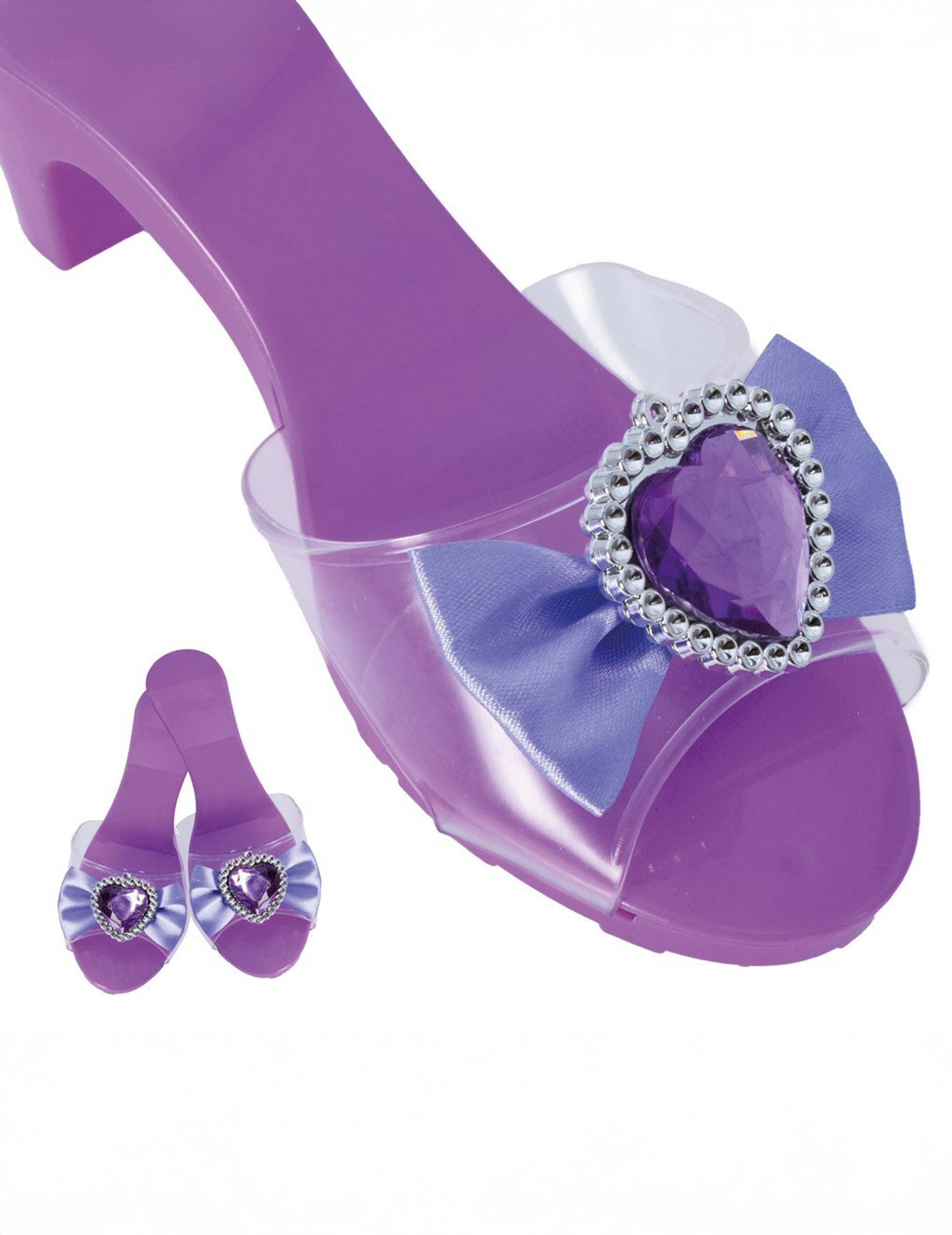 Fiecare pantof prezintă o culoare mov uniformă, o deschidere în față și un ornament în formă de inimă plasat deasupra, înconjurat de un decor strălucitor și asociat cu o fundiță decorativă. Silueta elegantă completează o rochie de prințesă sau un costum de poveste.