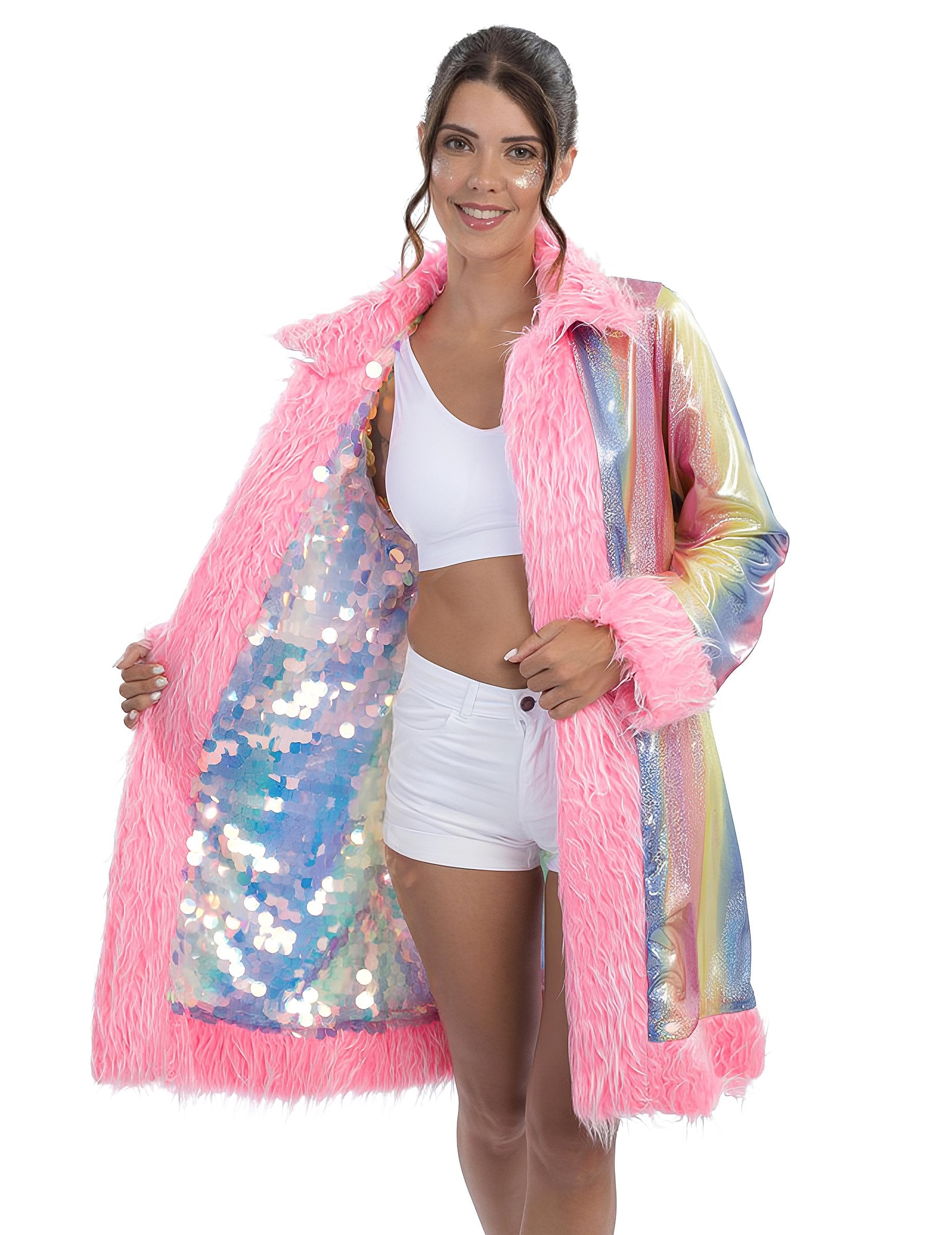 O parte este acoperită cu paiete iridescente, vizibile pe întreaga suprafață a hainei, în timp ce cealaltă parte este prevăzută cu o blană artificială roz pufoasă. Haina are un guler larg și o croială dreaptă care flatează silueta. Lungimea sa cade aproximativ deasupra genunchiului, fiind potrivită pentru a fi purtată peste o ținută mai scurtă sau mai atrăgătoare.