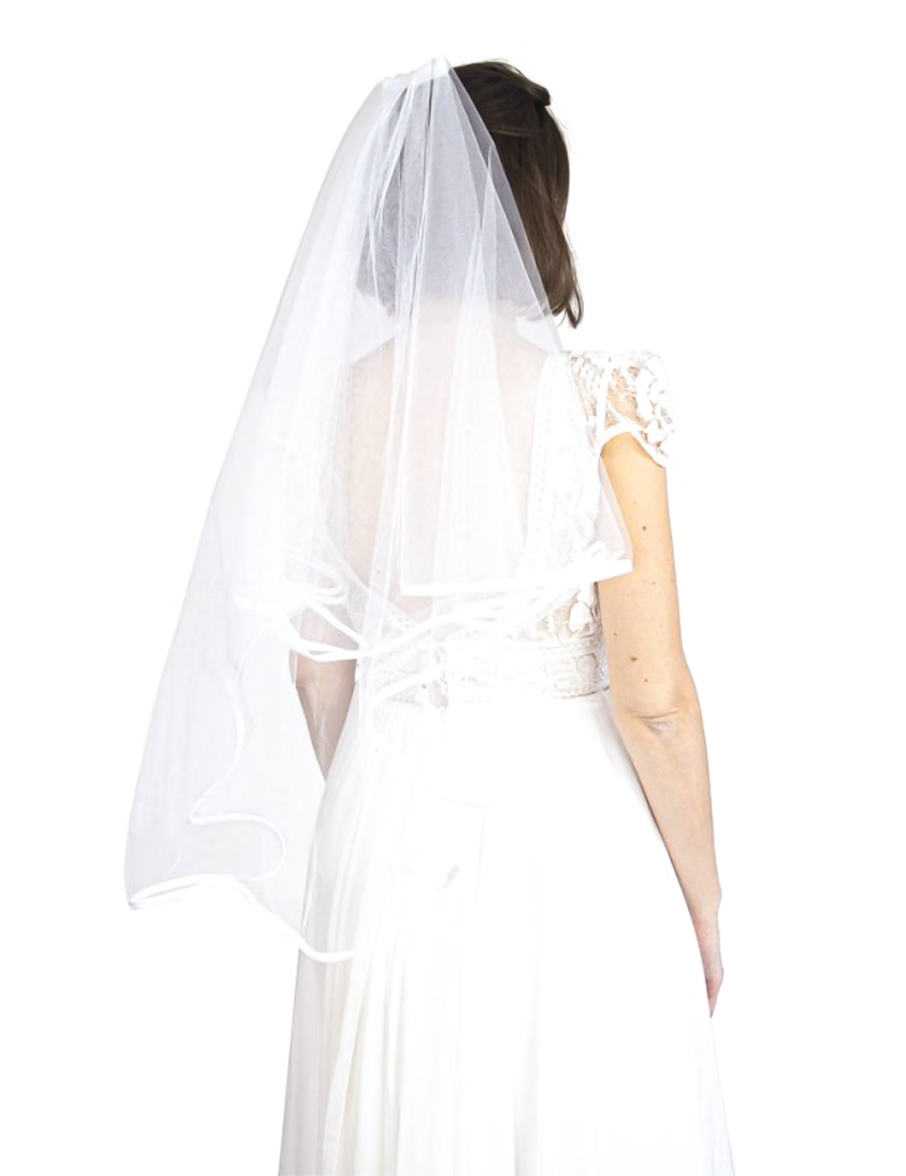 Voalul este confecționat dintr-un material ușor, alb, cu o margine satinată vizibilă, care îi accentuează delicat forma. Croiul său lejer cade natural pe spate și completează o rochie de mireasă sau o ținută formală cu o eleganță discretă.